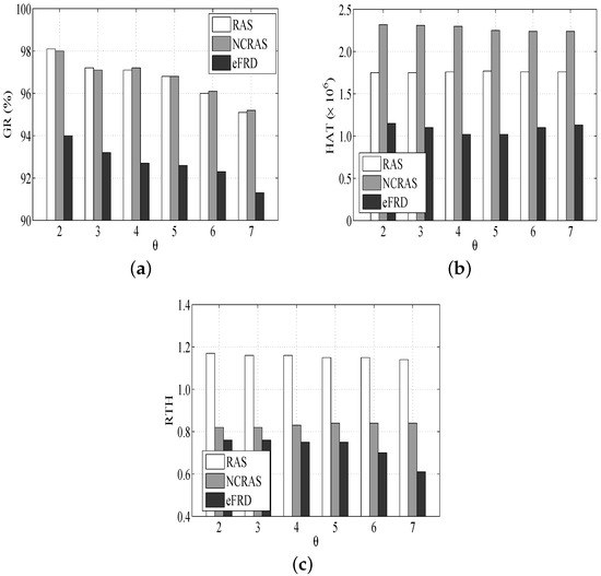 In Figure 5c, the s of RAS and NCRAS ascend. The of eFRD rises first and then drops. This is because it is assumed that its resources are fixed in eFRD. There are enough resources to accommodate most DAGs (ranging from 50–100). However, a further rise of the DAG count, DAG count > 100, leads to the saturation of the system, long running times of hosts and a low level of resource utilization. It also can be observed that the highest is in RAS, since it considers the consolidated resource mechanism.