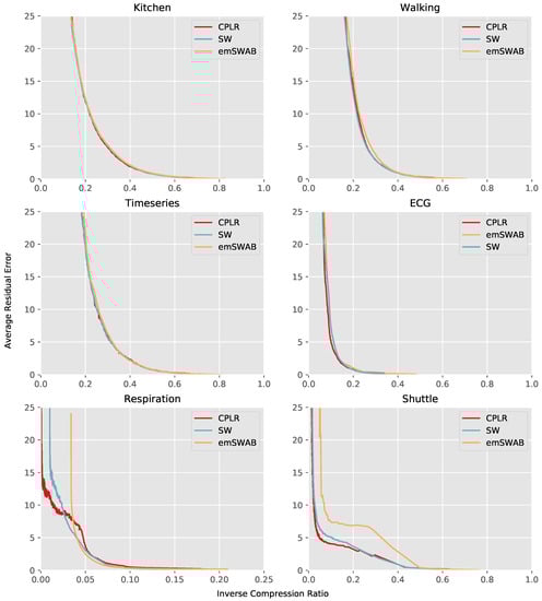 In our experiments, we evaluated 29 data sets with in total 536,175 samples, all of them approximated 10,000 times with emSWAB from threshold 1 to 10,000 and 100,000 times with both SW and CPLR from threshold 1 to 100,000. The range of thresholds at which emSWAB was performed in our experiments is smaller than for CPLR and SW, as the error metric of emSWAB is a sum of absolute distances. This is explained in the following. At a certain threshold, the emSWAB algorithm might lead to an operating point that can be achieved with CPLR and SW at a much higher threshold, since the sum of squares error in CPLR and SW reaches the threshold faster than the sum of absolute distances used in emSWAB. Thus, the range of thresholds at which CPLR and SW were evaluated in our experiments needed to be larger as for emSWAB in order to reach the same range of operating points for comparisons. Note, that the segment error is an absolute error for a whole segment while the average residual error is a per-sample error. Thus, the segment errors and correspondingly the thresholds are higher then the resulting average residual error in the plots.