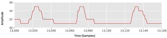 Figure 3, representing the respiration of the person while waking up. The over quantization leads to a signal mostly consisting of perfect straight parts, which can be seen in