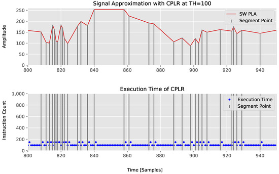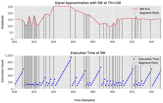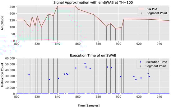 Table 1. Furthermore, it can be seen that the average instruction count for emSWAB increased, although the maximum instruction count decreased. This is explained by the fact of a smaller threshold leading to smaller segments, and thus the computationally costly segmentation process within the buffer is faster but performed more frequently. For SW, the minimum instruction count is 57 in this experiment. This is caused by the fact that the lower threshold leads to shorter segments and no segment is created due to an exceeding maximum segment size, which needs 46 instructions. Despite the latter, an instruction count of 57 is the shortest execution time of SW, which happens when only the first sample is added to a newly created segment. This small execution time is only achieved at the very first invocation of the SW algorithm after initialization. In all other invocations, the first sample is already added to the buffer upon segment creation, since a new segment’s end point is always created for the previous sample.