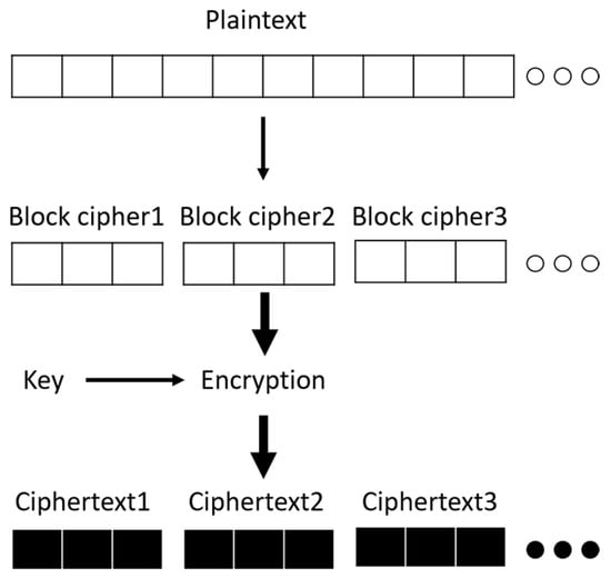 The ECB mode [19] is the simplest encryption mode in AES. As shown in Figure 1, the plaintext is divided into multiple blocks, and each block’s size is 16 bytes (128-bit). Then, each block can be independently encrypted in ECB mode. The advantage of ECB mode is its low encryption complexity, but its disadvantage is its lack of random encryption.