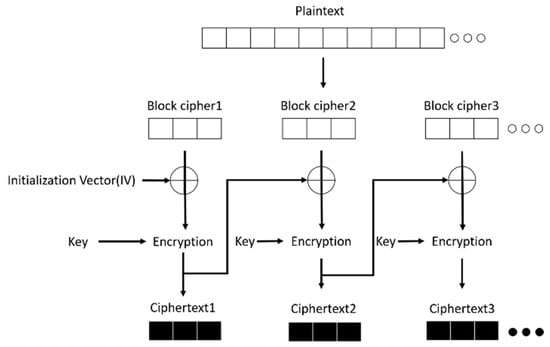 CBC-MAC is a process used to generate a message authentication code (MAC) using a block cipher in CBC operation mode. Figure 3 shows the CBC-MAC mode operation. The plaintext data to be verified is encrypted with a deterministic initialization vector in CBC mode, and the deterministic initialization vector is zero. Then, the plaintext data is divided into multiple blocks. The first plaintext block XORs the initialization vector before being encrypted by a key. Next, the result XORs the second message and is encrypted again by the same key. Some of the leftmost bits in the last message block are called authentication tags. The authentication tags are used in the message integrity check (MIC) of the CCM mode.