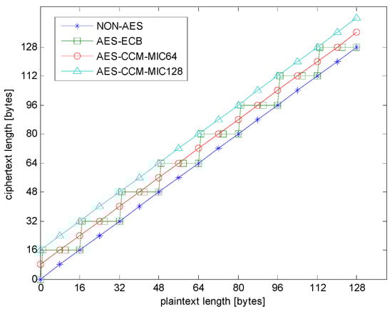 Figure 4 presents the packet length change after the encryption of AES-ECB and AES-CCM. The X axis represents the payload length before encryption, and the Y axis represents the encrypted data length after encryption. Note that non-AES is the experimental control group without any AES encryption, so its X-axis value always equals that of the Y-axis. The block unit of the AES-ECB was 16 bytes. When the length of payload in the block was less than 16 bytes, the other bytes were filled with zeros, and its ciphertext length was always a multiple of 16 bytes. For AES-CCM, the ciphertext length was always longer than or equal to the plaintext length, and the additional length was the length of MAC, which was 8 or 16 bytes.
