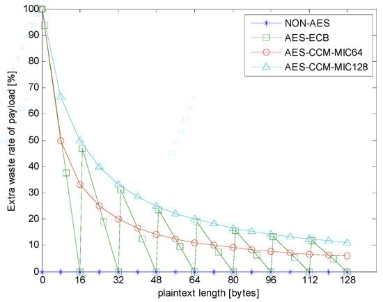 Obviously, the extra waste rate of AES-ECB decreased more quickly than other that of other types when the plaintext length was less than 16 bytes. However, as the plaintext length increased, this advantage of AES-ECB gradually reduced. Moreover, AES-CCM had higher security because of Nonce, and AES-CCM output different ciphertext when the plaintext was repeated. Therefore, if the plaintext exceeds a certain length, AES-CCM is theoretically more competitive.