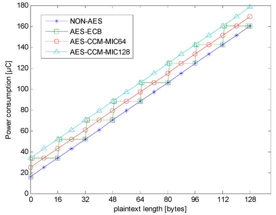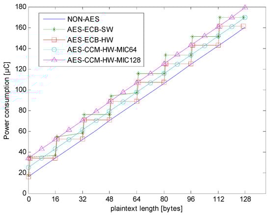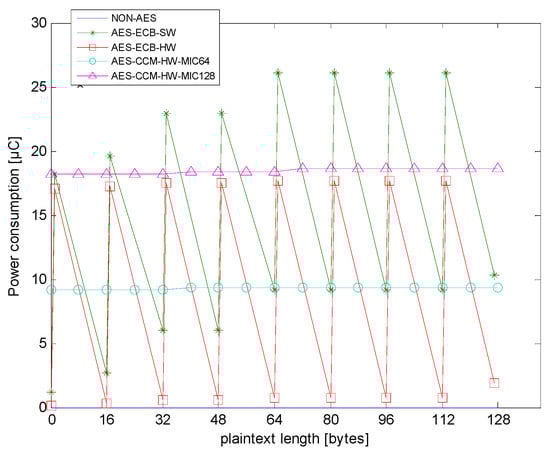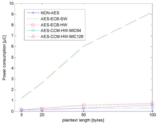 Figure 7 shows the power consumption of the transmission. It can be seen that the overall power was mainly affected by the payload length. Therefore, the trend of Figure 7 is similar to Figure 1. There was no difference in transmission time between AES-ECB-SW and AES-ECB-HW, so their transmission power consumptions were the same.