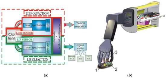 The concept of «”olfaction”; (a) Block scheme of “olfaction”; (b) Adjustment scheme of Laser Induced Fluorescence (LIF) and Laser Induced Breakdown Spectroscopy (LIBS) for the anthropomorphic complex. 1—laser radiation for LIBS; 2—laser radiation for LIF; 3—lens to focused radiation to spectrofluorometer.