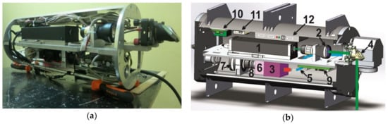 (a) Submersible module of the LIF sensor; (b) Setup scheme of the submersible module of the LIF device: 1—laser; 2—collimator; 3—spectrometer; 4—rotary mirror of the output radiation; 5—optical multi-core fiber; 6—electro-optical converter; 7—CCD camera Videoscan-285 USB; 8—lens; 9—ITX-N29 processor board; 10—48 to 12 V converter for onboard power supply (laser power supply); 11—48 to 5 V converter (ITX-N29 power supply); 12—computer-controlled laser power supply unit.