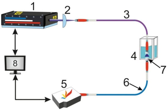 1—Q-Smart 850 (Quantel, Les Ulis, France)/Tsunami + Spitfire 40f-1k-5W (Spectra-Physics, Santa Clara, CA, USA); 2—lens; 3—quartz fiber; 4—cuvette with solution; 5—Maya 2000 Pro spectrometer (Ocean Optics, Largo, FL, USA); 6—fiber with a core diameter of 600 µm; 7—collimator 74-UV (Ocean Optics, Largo, FL, USA); 8—computer.
