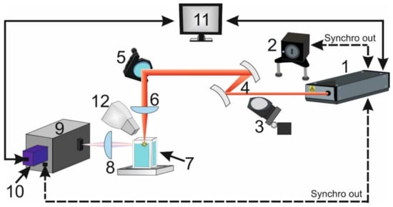 Femtosecond laboratory setup. 1 — Tsunami + Spitfire 40f-1k-5W femtosecond laser complex (Spectra-Physics, Santa Clara, CA, USA); 2—PSCOUT PL-SP-LF (Spectra-Physics, Santa Clara, CA, USA) autocorrelator; 3—folding mirror; 4—1.5× telescope; 5—mirror; 6—KPX094AR.16 (NewPort, Irvine, CA, USA) focusing lens, 7—cuvette with solution, 8—collecting lens, 9—Spectra Pro 2300 spectrograph (Princeton Instruments, Trenton, NJ, USA), 10—ICCD camera (Pi-MAX 3, 1024×1024 pixels, Princeton Instruments, Trenton, NJ, USA), 11—computer, 12—aspirator (for lens protection from water drops).