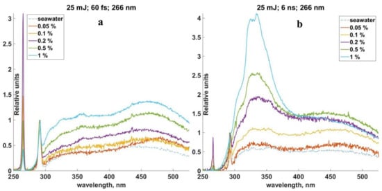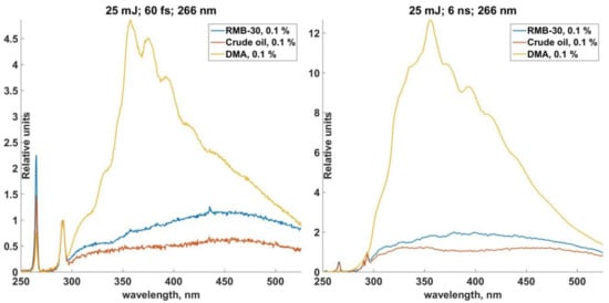 LIF spectrums of crude oil solutions, which were received in laboratory experiments, are shown in Figure 5. Spectrums, which were received by femtosecond laser pulses, are on the left side and spectrums of nanosecond laser pulses are on the right side. Different concentrations of oil are marked by different colors on the diagram (the color of each concentration is explained in the upper side of the figure). Relative values of LIF signal intensity were calibrated to the intensity of the Raman scattering of seawater and were laid off along the vertical axis. Parameters of laser radiation, which were used in this experimental work, are located in the upper part of the diagrams.