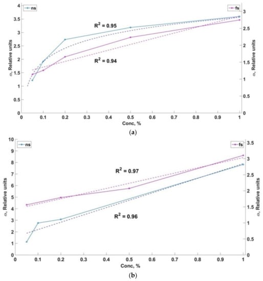 The value of α parameter is laid off on the vertical axis (left one is for nanosecond laser pulses and wright one is for femtosecond laser pulses). The concentration of the oil products solution (%) is shown on the horizontal axis. The coefficient of determination R2 corresponds to the approximation function marked by the dash line.