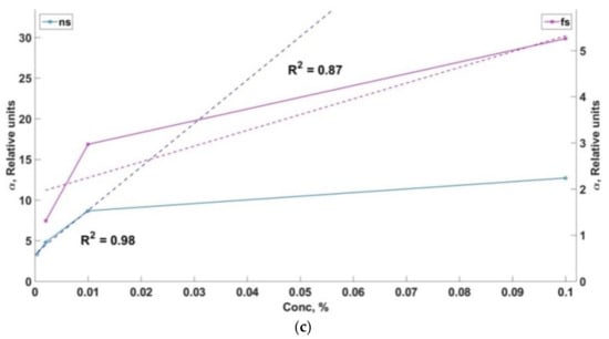 There are calibration functions of different solutions of oil carbons in seawater in case of the usage of nanosecond and femtosecond laser pulses in Figure 7a–c.