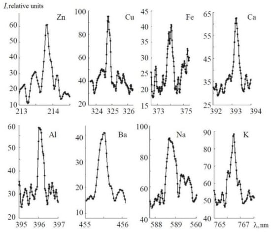 Fragments of emission lines of Zn, Cu, Fe, Ca, Al, Ba, Na and K solutions are shown in Figure 8 in spectral ranges, which were chosen for the investigation of the laser plasma dynamics.
