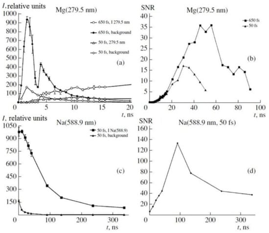 The estimation of the optimal values registration delay to the laser pulse (td) and exposition time (tg) was provided for all the elements that we chose and for two of the values of laser pulse durations. Time dependency of emission line intensity of MgI (279.5 nm) and Na line (588.9 nm) are shown in Figure 6. Also, a dependence of the value ratio of the emission line intensity to the intensity of the continuous spectrum in the spectral interval (SNR), which is the most close to the emission line, is also shown. These dependences for Mg are shown in both laser pulse durations of 50 fs and 650 fs (Figure 9a). It is clear that the most intensive background was observed in the first 10 ns when the duration was 50 fs and 650 fs, at the same time intensity the emission line was close to a maximum of 10 ns. Concerning the abovementioned facts, the signal-noise ratio begins to rise rapidly only in the first 10 ns.