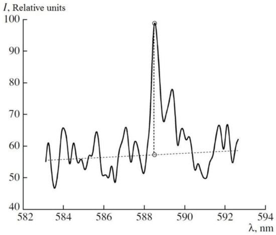 The spectrum of the Na atom is shown in Figure 10 and it performs the way to choose the intensity of the emission line and the background intensity of the plasma radiation. The limit of detection of the Na atoms was detected in a water solution of NaCl concerning the SNR time dependence for the Na emission line and the measurement for different concentrations. The LIBS method provided a limit of detection about 1 µg/L concerning the following parameters. A pulse of 650 fs duration, energy of 1 mJ, time of delay td = 75 ns, and tg = 300 ns were used. The signal was averaged by 800 laser pulses when the radiation frequency was 100 Hz.