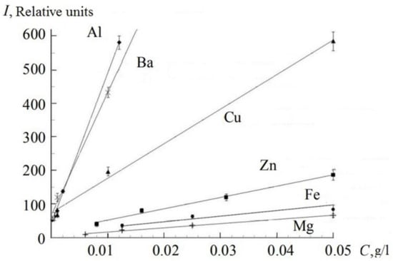 Figure 11 shows the calibration curves obtained for Al, Zn, Cu, Ba, Fe, and Mg with concentrations <0.05 g/L. We took the average intensity of the spectral line (see Figure 8), obtained as a result of six measurements, after subtracting the background intensity. All the calibration lines, obtained for concentrations <0.05 g/L, were approximated by linear dependence.