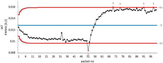 Figure 5 of the EWMA plot for IAT against packet number. The shift detected exceeded the out-off-control signal by first breaking the LCL before rising and braking the UPL. This again shows the efficiency of our proposed algorithm.