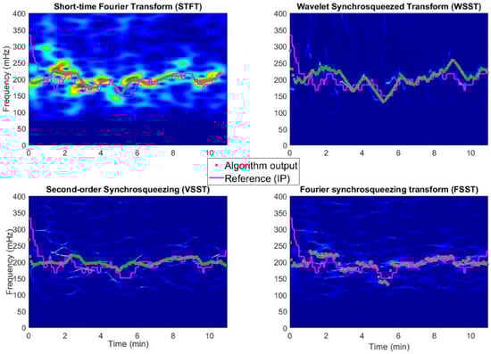 Mathematical basis and the nature of application proposed for this method has been given in [20,23] and was performed with parameters identical to STFT and FSST. Like for the other reassignment methods, PPGRIAV signals were represented as TF spectra to provide the tracking algorithm with enhanced frequency resolution. We have implemented these methods as they were presented in [20] to form the spectra.