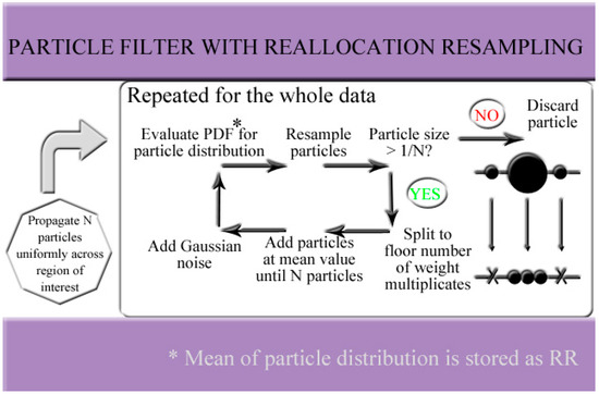 At each state update cycle, some particles with negligible weights will be discarded as irrelevant. Without being taken care of, the particles would, after a long enough time, converge to a single point in the state that is closest to the largest component of the spectra and later points in time no longer affect the outputs of the filter. This undesirable behavior, generally known as particle degeneracy, is the result of convergence negligence of the weight updates. This diminishes the undesired state regions where spectra components are valued low in weighted nearest neighbor sense and thus considered irrelevant. However, to consider the future responses in RR, the entire ROI should be accessible in practical, dynamically changing inputs. This issue has led to numerous resampling schemes, that is, manners in which new particles are propagated to uphold the number of particles in each updated round of particle filtering. In order to provide a filter construction with small particle distribution variances, we have relied on reallocation resampling in the degeneracy problem, which has an advantage of decreased resampling variance (the new particles are located close to the previous PDF center) compared to traditional resampling [26]. The general structure of the particle filter is illustrated in Figure 3. The particles with greatest weights are preserved according to splitting criteria: in reallocation resampling, a particle is split to floor number of its weight divided by a threshold weight 1/N, where N is the number of particles, while particles with weights less than the threshold weight are discarded. This results in varying particle set sizes.