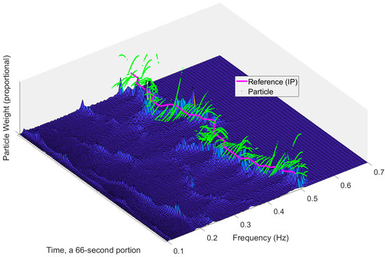 Response of the particle filter to a 66-s segment of subject data in wavelet synchrosqueezing transform (WSST). Particle filter exhibits fast response to underlying signal variations given that time resolution of the system model is adequate.