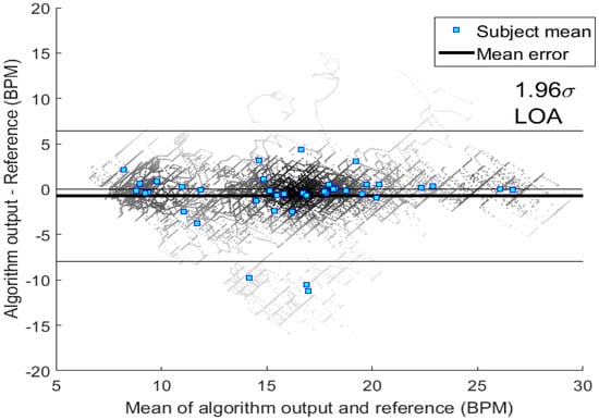 Bland-Altman plot for the WSST. The individual RR-results are represented by their density (Voronoi tessellation). The average values of the individual subjects are shown with blue squares. The three subjects outside the 1.96σ limits are subjects 22, 31, and 34.