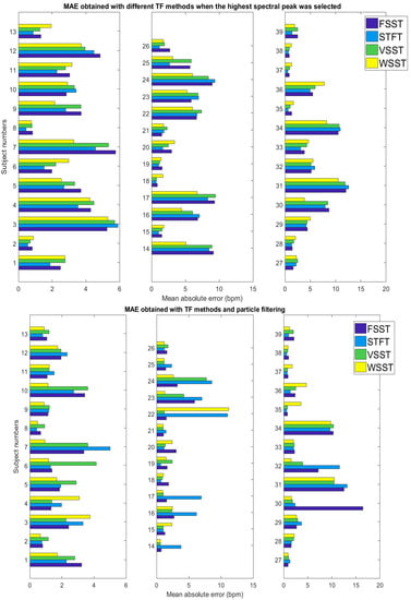Comparison of mean absolute error between the methods in each subject. Upper: mean absolute error (MAE) for each TF method if only frequency component with highest spectral peak component is selected, disregarding particle filtering. Lower: MAE when particle filtering has been applied.