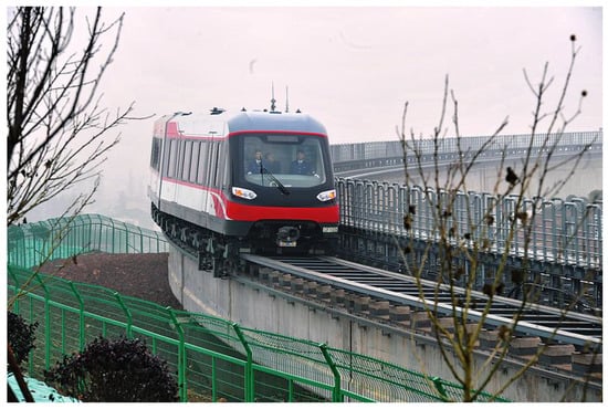 The magnetic levitation (maglev) train is a kind of promising transportation system that replaces wheels by electromagnets and levitates on the guideway via non-contact electromagnetic force. It offers numerous advantages over the conventional wheel-on-rail system: (1) it is suitable to operate as a city transportation tool without disturbing the residents due to its low noise; (2) electromagnets and specially designed tracks prevent the trains from derailing; (3) its property of small turning radius and strong climbing ability lowers the difficulty for route planning in mountainous landscapes and densely populated areas; and (4) it provides a consequent reduction in maintenance costs, and so forth [,]. Recent running maglev trains in the Changsha Maglev Express (Figure 1) and the Beijing Maglev S1 have shown its widespread application prospects.