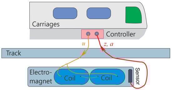 A simplified maglev system is presented in Figure 2, which consists of carriages, track, electromagnet and sensor. In this simplified maglev system, the sensor embedded on the electromagnet is an integrated sensor offering gap signal and acceleration signal. It acquires gap between the lower surface of the track and the upper surface of the electromagnet, the acceleration of the electromagnet and transmits these signals to the controller via field bus. The current sensor and the voltage sensor are located inside the controller, which offer the current value through the coil and the voltage exerted on the coil. After acquiring these sensor signals, the controller computes control output based on particular control law and then generates output voltage onto the coil. When there is voltage exerted, current is generated inside the coil, and the magnetic force levitates the electromagnet upwards together with the carriages. During this process, the controller regulates the output voltage dynamically to maintain the balance between the electromagnetic levitation force and the weight of the carriage.