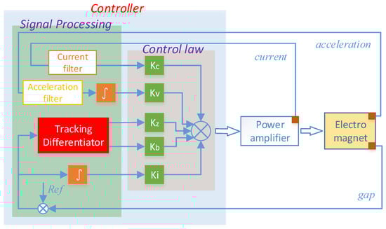 In the real system, the displacement z is substituted by the levitation gap  from the gap sensor, and the velocity v is substituted by the integral of the acceleration a from the accelerator. Additionally, to reduce static error, the integral of the levitation gap error is also included into the control output. Thus, Equation (2) can be transformed into: