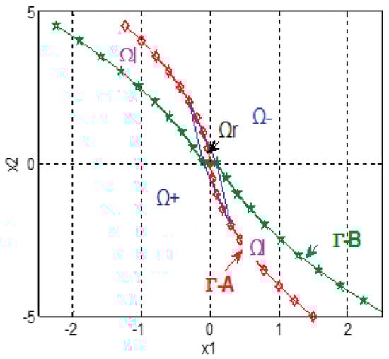 It is obvious that, in region , ; in the region , . The difference for control strategy between continuous system and discrete system exists when the state point belongs to the linear region  and the reachable region . When state  is in the linear region , to avoid the chattering, a linearly changing comprehensive function  is chosen to make the next state  moves along the switching line towards the origin steadily. Make a horizontal line through point  on the phase plane, thus this horizontal line has two cross points with  and . Then, define the cross points as A, B, and their x-axis values are defined as , ; then, a linearly changing control variable: