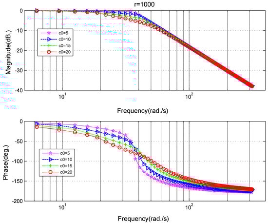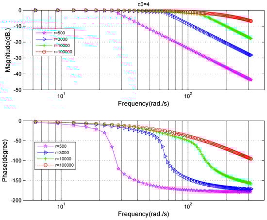 The fast parameter r and filtering parameter  are strongly related to the performance of the tracking-differentiator. In order to select proper parameters and make adjustments if it is needed, influences of different parameters on TD’s frequency characteristics are indispensable. A frequency scanning method can be employed to obtain these relationships. The frequency characteristics at different values of the parameter r can be seen in Figure 6. At the low-frequency section (frequency < 40 Hz), the amplitude gain is close to 1, the phase lag is small. At high-frequency section (frequency > 100 Hz), the amplitude gain decreases and phase lag increases, which makes it able to suppress high-frequency noise. The crossover frequency for amplitude gain increases and the phase lag decreases as r increases, which means the increase of r strengthens the tracking property while weakens the filtering property. The frequency characteristics at different values of the parameter  can be seen in Figure 7. As  increases, the amplitude gain decreases gradually, which means that the filtering ability increases and correspondingly the phase lag increases with  at the same time. When , the phase lag is pretty large, which is not a good thing for the system’s stability [].