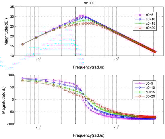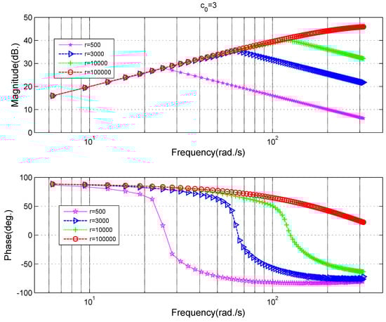 The influences of different parameters on the differential frequency characteristics of TD can be acquired in the same way. Figure 8 is the case for different values of parameter r and Figure 9 is the case for different values of parameter . The explanation of these differential results are similar to those for the filtering case in Figure 6 and Figure 7, so it will not be made in detail. The key point is that there is a turning point for the amplitude–frequency relationship in Figure 8 and Figure 9,which means that the high frequency noise will not be amplified by the differential of TD compared with the classic differentiator (8).