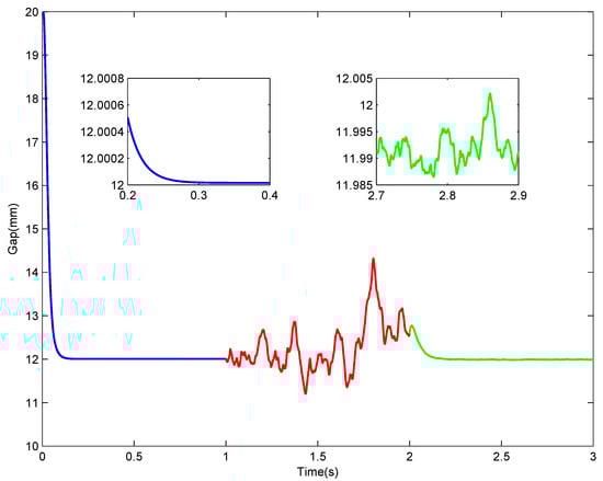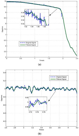 - Since there exist inevitable electromagnetic disturbances, which exert an influence on the working condition of the gap sensor, the gap sensor generates not only real signals that reflect the real gap information, but also noise that may influence the normal functioning of the controller if this noised gap sensor is utilized directly as the feedback without preprocessing. To minimize the influence caused by this kind of noise disturbance, a gap sensor signal must be filtered before it is used by the controller. At present, most commonly used filters for gap signals are simple first-order low-pass filters, for which the filtering performance and the real-time requirement contradict each other. To enhance the filter’s performance, a big filtering coefficient is required, whereas a big filtering coefficient usually causes a large phase lag that undermines the stabilities of the levitation system []. A new filtering strategy with higher filtering performance and smaller phase lag is needed.