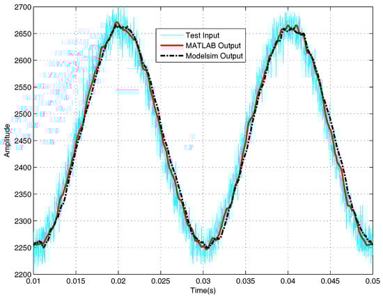 To get a more precise analysis of the filter’s performance, observing the waveform in Modelsim is neither convenient nor sufficient. Therefore, processing all these input and output data in MATLAB is a better way. First, computation in MATLAB has a more precise result, which can be treated as a standard to judge whether the result obtained from the VHDL program is accurate or not. Second, MATLAB has a more powerful signal processing ability, not only displaying the signal in the time domain but also displaying the signal in frequency domain. Figure 13 and Figure 14 are comparisons of the computation results in VHDL and the computation results in MATLAB. For filtering, the average error between MATLAB result and VHDL result is 0.509, the ratio of this error to the mean value of the output signal is 0.02%; for the differential, the average error between MATLAB result and VHDL result is 2.316, the ratio of this error to the mean absolute value of the output signal is 0.21%. The two results are very close; both the red signals obtained in MATLAB and the black signals obtained in Modelsim are effective processed results. Assuming the results in MATLAB are accurate, the simulation results indicate that the computation results in VHDL are precise as well.