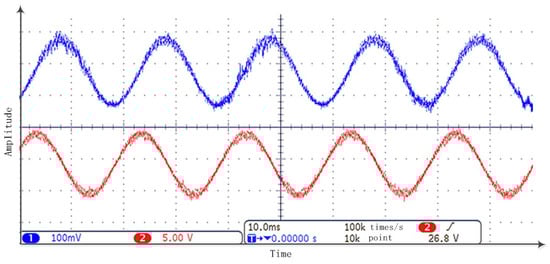 After the MATLAB-Modelsim simulation, an independent experiment is made to check out this TD’s performance in an FPGA processor. The idea is generating the desired test signal, processing it in an FPGA processor and making a comparison between the input and the output signals in an oscilloscope. Given a 50 Hz sinuous test input signal, the filtering performance is shown in Figure 15 while the differential performance is shown in Figure 16. In both figures, the blue signal in channel 1 is the input signal and red signal in channel 2 is the processed signal. It can be concluded that both filtering and differential results are satisfactory.