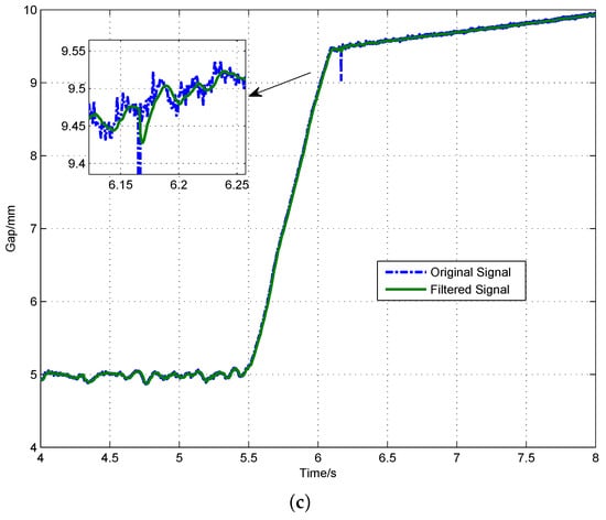 Original gap signal and filtered signal. (a) rising process; (b) levitation process; and (c) falling process.