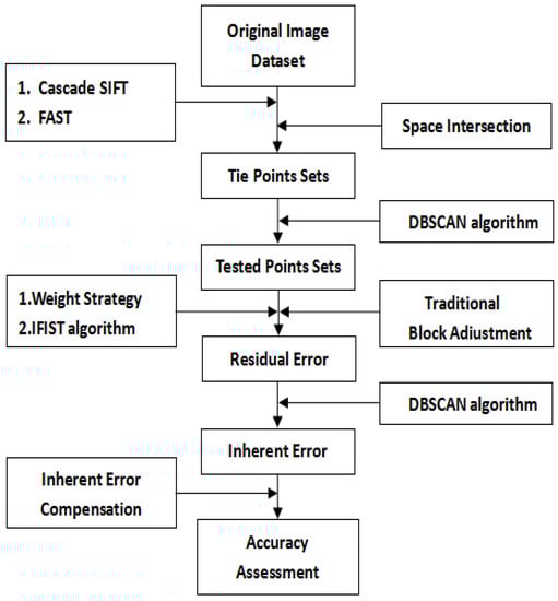 Figure 1 shows the main steps of our proposed method. Unlike some traditional methods, our proposed method includes two stages, which are summarised as follows and described in detail below: coarse correction and accurate correction, which are comprised of the following five steps. Firstly, the tie point sets are obtained after the image registration step with the help of the cascade scale-invariant feature transform(SIFT) algorithm and features from accelerated segment test (FAST) method and the space intersection step. With the extracted dataset clustered by the DBSCAN algorithm, traditional block adjustment with the improved FIST algorithm and the proposed weight strategy are applied to improve the geometric positioning accuracy. Then, the data clustering method is applied for a second time to analyze the distribution of residual errors in order to extract the inherent satellite platform errors of our experimental dataset. Finally, the inherent error compensation model is established with the help of the clustering method, aiming to reduce the inherent errors. The main steps of our experiments are introduced in detail in the following context.
