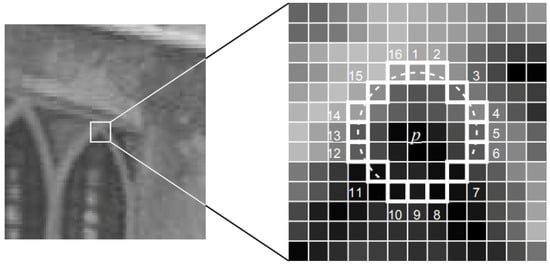 After the accurate image registration, an effective corner detection method—the features from accelerated segment test (FAST) method []—is applied to acquire the tie point sets. A 9 × 9 window is used to strengthen the stability of the tie point matching process, as shown in Figure 2. The characteristics of the neighborhood of a tie point is calculated by the ratio as: