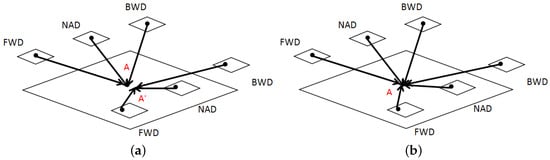 Comparison of (a) tie point pair and (b) tie point set. A and are different observations of the same object at different times. FWD, BWD, and NAD are the ZY-3 satellite images from the forward-, backward-, and nadir-directed cameras, respectively, for the same observation.