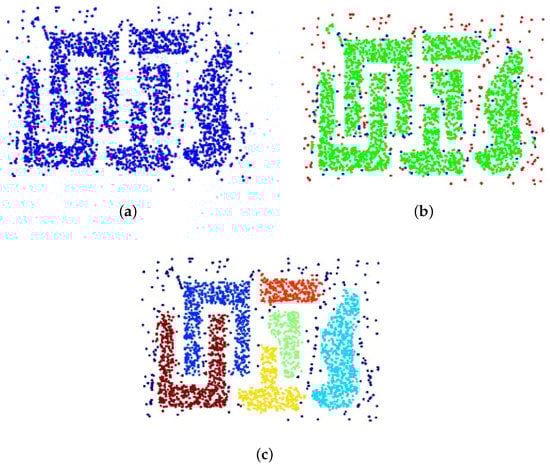 The explanation of the density-based spatial clustering of applications with noise (DBSCAN) algorithm. (a) is the original distribution of the dataset. (b) is the distribution of different type of the dataset: core (green) points, border (blue) points and noise (red) points. (c) is the cluster results with the DBSCAN algorithm applied to the dataset.