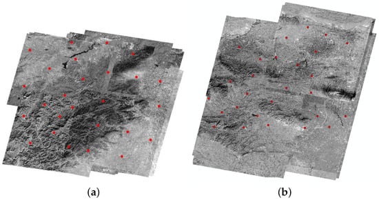 In our experiment, 95 multi-observation images of Beijing and Songshan from ZY-3 were tested, covering a total area of about 35,000 km and acquired from February 2012 to January 2015, with the largest time interval being 2 years and 11 months. In the Beijing area, the elevation ranges from 30 m to 1900 m with a few mountainous areas. There were 26 tie point sets in the experimental area, 18 of which were check point sets and all 281 tie points were extracted in 35 images. The maximum number of overlapping images was 22. For the Songshan area, there were 20 groups of ZY-3 image pairs and 27 tie point sets. Twenty of them were check point sets and a total of 423 tie points were distributed in all 60 stereo images. The elevation of this area ranges from 72 m to 1200 m, with most mountains distributed throughout the area. The maximum number of overlapping images was 31. The experimental area and distribution of the tie point sets are shown in Figure 5.