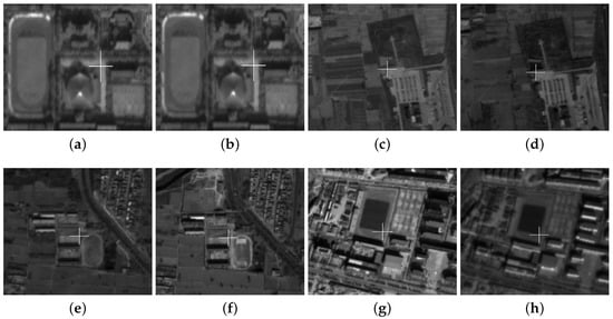 Examples of tie point sets. (a,b) are two examples of the extracted image-space points from different images in tie point set P14, where the centers of the crosses are the extracted image-space point correlated with the object in object-space. (c,d) are two examples of the extracted image-space point from different images in tie point set P22, (e,f) are two examples of the extracted image-space point from different images in tie point set P34, and (g,h) are two examples of the extracted image-space point from different images in tie point set P53.