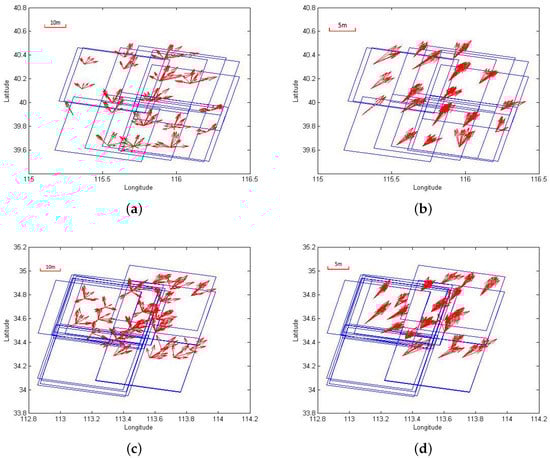 Comparison of error distribution of each check point set of (a,b) Beijing and (c,d) Songshan area. (a,c) Represent the original error distribution, while (b,d) represent the residual error distribution after block adjustment.