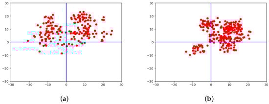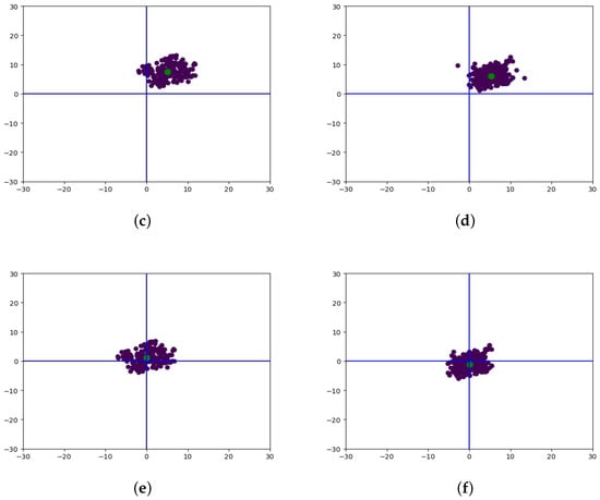 Supposing we have a dataset as shown in Figure 4a, and all points in this dataset can be divided into three types: core points (green points distributed inside the dense regions in Figure 4b), border points (blue points distributed at the edge of the dense regions in Figure 4b), and noise points (red points distributed in sparse regions in Figure 4b). In order to separate each type of these points with no a priori knowledge, their density distribution is important information that we can rely on. Two parameters are set before the density-based searching: represents the max distance between neighborhood points in the same category and , which means the minimum number of points in one category. Searching from one point randomly in the tested dataset at first, if there are more than points in the neighborhood of this point, it can be regarded as a core point and it can form a category. If the distances between points which do not belong to this category and the number of points in the formed category are smaller than , then these points are added to the formed category. If there are points which do not belong to any category, they are regarded as noise points. In this way, different categories can be formed and the noise points are separated from each category as shown in Figure 4c. An appropriate set of and can achieve a satisfactory output of the classification process. Compared with other classification algorithms, the DBSCAN algorithm can detect the number of categories in the test dataset with no bias in the shape of clusters. Moreover, noise points can be quickly separated from other information in the dataset with no prior knowledge. With the help of the DBSCAN algorithm, we classify our dataset while identifying noise points to achieve a better convergence.