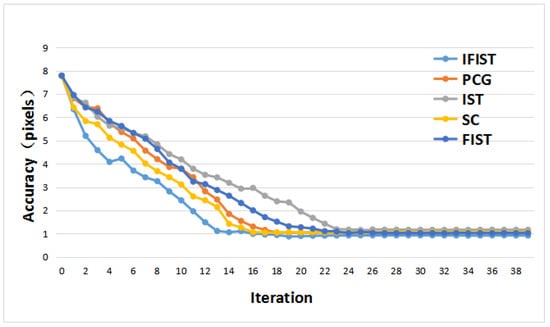 The advantage of our proposed method which we tested with dataset of the Beijing area can be obtained by comparing the outputs of each method, which are shown in Figure 9 and Table 2. The accuracy refers to the mean value of the residual errors in image-space of each tie point, and the time consumed was conducted with the same condition of 15 iterations. Figure 9 displays the convergence of different methods with the same dataset. The IFIST algorithm was the fastest with a convergence of 13 iterations, the SC and PCG algorithms converged to stable results with almost 18 iterations, while the FIST and IST algorithms needed more than 22 iterations for their convergence. The time consumed by each method is the product of iterations and the time consumed for each iteration. Thus, the time consumed for 15 iterations and the accuracy of each method are shown in Table 2. The convergence of our proposed weight strategy of the Beijing and Songshan areas with the IFIST algorithm are shown in Table 3.
