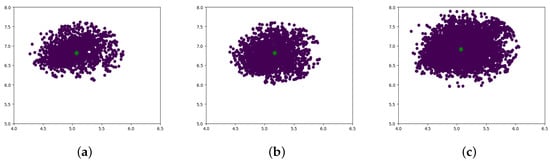 Examples of the error cluster center distribution of each combination. (a) The cluster centers distribution of 3416 groups of the combinations of 23 images; (b) The cluster centers distribution of 5468 groups of the combinations of 38 images; and (c) The cluster centers distribution of 8437 groups of the combinations of 54 images.The purple points are the cluster centers of each combination and the green points are the newly calculated cluster centers in all purple points.