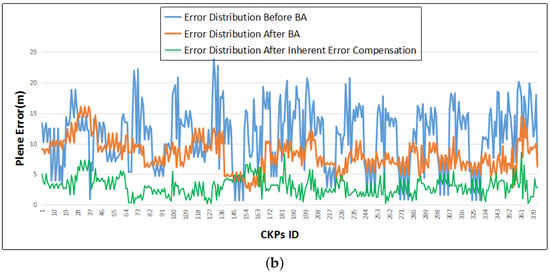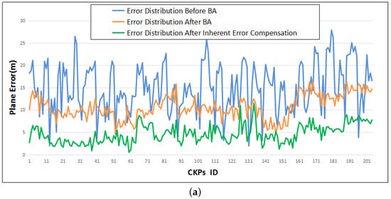 Furthermore, the results in Figure 8e,f are more intuitive to show the improvement of the geometric positioning accuracy of the tested datasets, and the convergence of the computations performed better compared with the results before the inherent error compensation. Figure 11 displays the improvement of the control point free block adjustment model and the inherent error compensation model. The blue line represents the error distribution of all check points in the resulting vector directions of latitude and longitude, the orange line represents the error distribution after control point free block adjustment, and the green line is the error distribution after the inherent error compensation.
