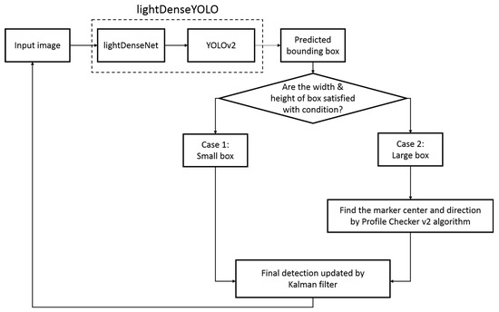 Figure 1 shows the overall flowchart of our proposed method. We resized the original input image taken by drone camera from 1280 × 720 pixel (px) to 320 × 320 px to fit the input of our CNN lightDenseYOLO. The output of lightDenseYOLO was a set of bounding boxes which potentially include a marker. Among these predicted boxes, we selected the box with the highest confidence score. However, when the distance between the drone and the marker was large, the predicted box was very small, and it was difficult to predict the direction of the marker inside it. Therefore, we categorized the predicted bounding box based on its size. In our research, a box with width and height larger than 150 px was a “large” box and a “small box” had a width or height smaller than 150 px. If the predicted box was a small box, the center of the predicted box was chosen to be the marker center. If a large box was detected, we extracted the predicted box as an image and put it into the Profile Checker v2 algorithm to find a more accurate marker center and direction. We also used a Kalman filter [40] to increase the accuracy of the obtained center. Our previous study showed that using a Kalman filter not only helps to stabilize the overall prediction but also helps deal with occlusion and blurring.