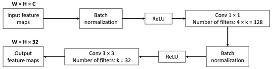 In Equation (3), is the concatenation of feature maps produced from layer 0 to layer l − 1. Therefore, if the network is very deep, the number of channels of this concatenated feature maps is very large. To avoid making the network too large, DenseNet introduced a bottleneck layer to make sure that the number of output channels at each layer was a fixed number. Here, can be defined as a bottleneck layer which includes layers: BN, ReLU, 1 × 1 conv, BN, ReLU, and 3 × 3 conv. As shown in Figure 2, the bottleneck layer reduces the number of output channels from C to 32, where C is an arbitrary number larger than 32. In this research, we designed the number of channels of output feature maps at each bottleneck layer as 32.