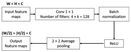 An essential part of CNN is reducing the spatial size of feature maps by pooling. DenseNet divides a network into multiple dense blocks by transition layer. We can also define as a transition layer that includes BN, 1 × 1 conv and 2 × 2 average pooling. Figure 3 shows how a transition layer reduced the spatial size of the input feature maps by half. The output of the transition layer is the input to the next dense block. Figure 4 shows an example of a dense block with four bottleneck layers and a transition layer.
